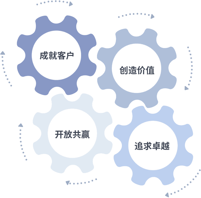 成就客户是一切决策的出发点,,,,创造价值是衡量所有工作的标准,,,追求卓越是尊龙·Z6做事做人的态度,,,,开放共赢是尊龙·Z6的格局也是最终的结果。。。。价值观的齿轮环环相扣,,推动着组织里的每个人不断向前。。